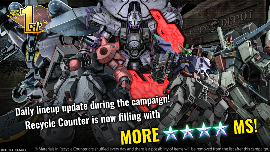 The Recycling Window’s expanded to include several hot items. Now you can exchange for missing mobile suits like the powerful 4★ Moon Gundam, Dag Doll, and Zaku IV (IP), plus the coveted “Overtune [Mobility] Lv1” custom part to supercharge your arsenal!