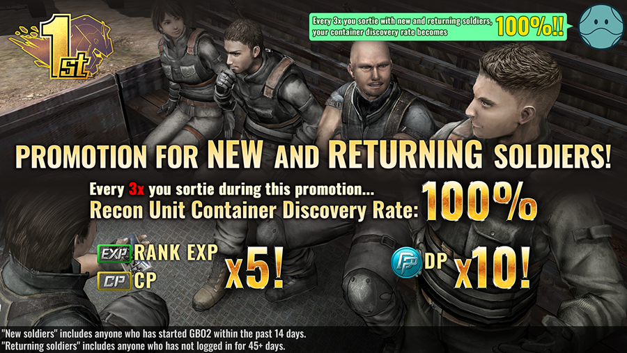 - Guaranteed Survey Unit containers! We’re boosting the discovery rate to 100% every three battles, so you’ll get valuable items every time you fight alongside new or returning pilots (and for frequent GBO2 players battling with you too!)