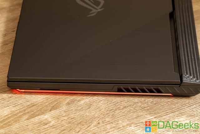 ASUS, this side is where right-handed gamers place their mouse, and it’s not very friendly to have toasty fingers after a gaming session. The downfiring speakers leave a lot to be desired. It is loud, no question about that, but the positioning makes it bounce on whatever it’s placed on and makes it sound like you’re in a cave.