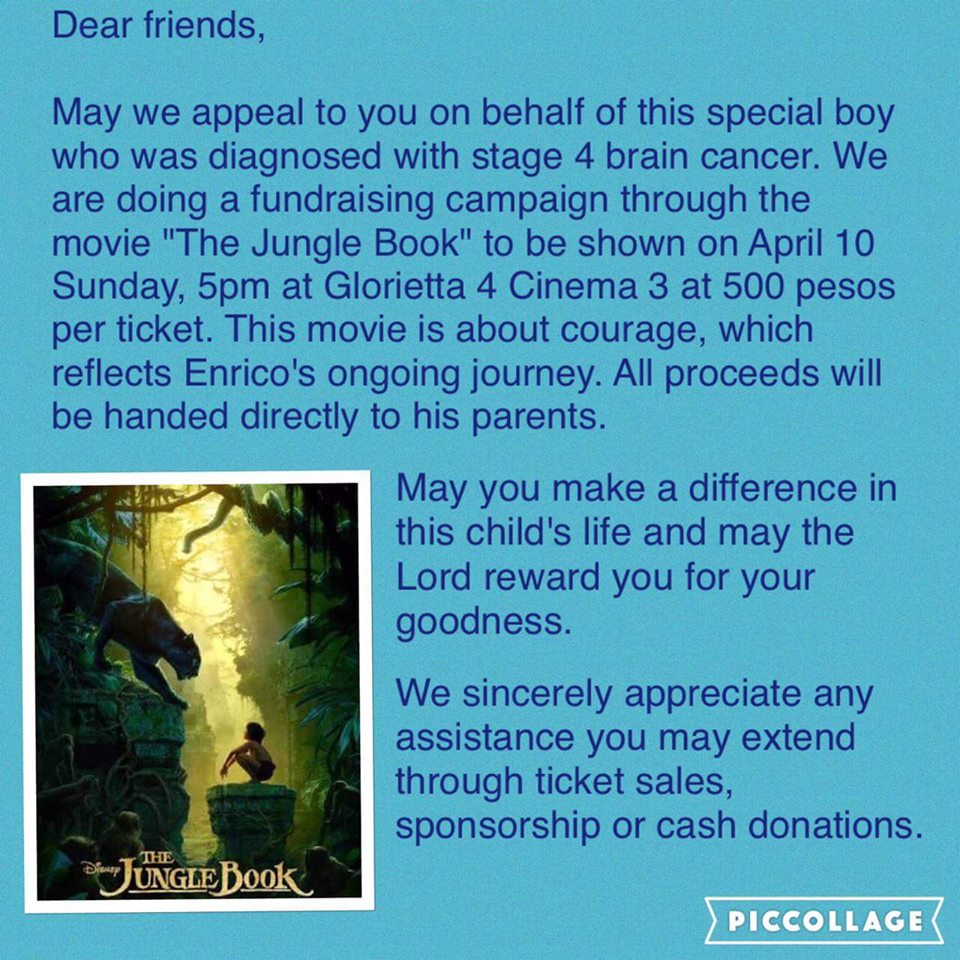 The screening will be held on April 10, 2016 as a fund raiser for Enrico Urbano, who has been battling with not one, but six brain tumors. With the three tumors removed in a recent surgical procedure the parents are in need of sponsorship and cash donations as the bills keep piling up and with another impending procedure to remove the remaining three tumors.