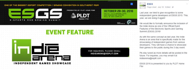 In the series of updates in preparation for October, the official ESGS event fanpage has Indie Arena as one of it’s official features for this year’s ESGS 2016.