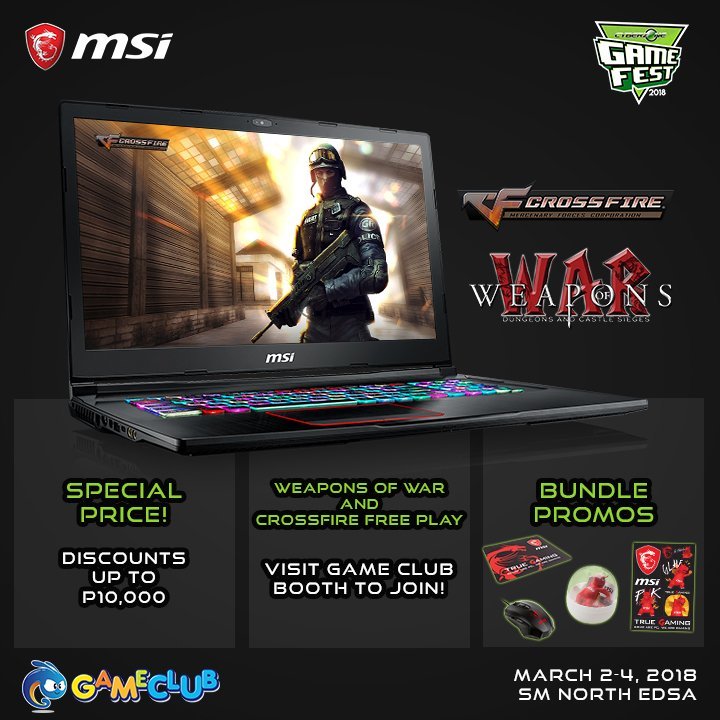 As the event’s official sponsor, MSI Gaming laptops will be showcased during the event. The MSI Gaming laptops will also be found in the GameClub booth, where attendees can enjoy their games like, Crossfire, Weapons of War, and LoveBeat. Plus the laptops will also be used for their Crossfire tournament on day 1, March 2, 2018.
