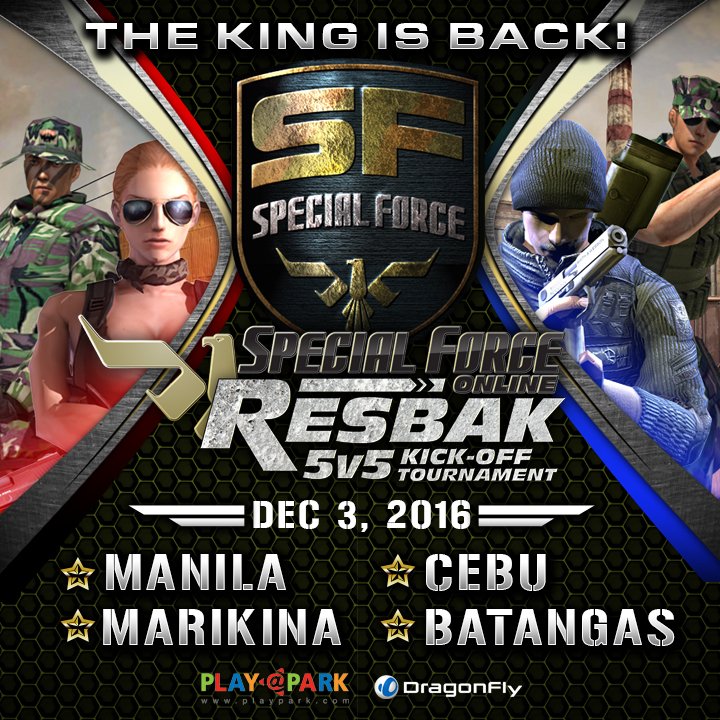 Titled as Resbak 5v5 Kick-Off Tournament. Special Force Online will be having simultaneous tournaments on four locations in the whole country. 16 teams from Manila, Marikina, Batangas and Cebu will face to face each other in a race to 5 series of matches to take home prizes for as high as 10,000 PHP.