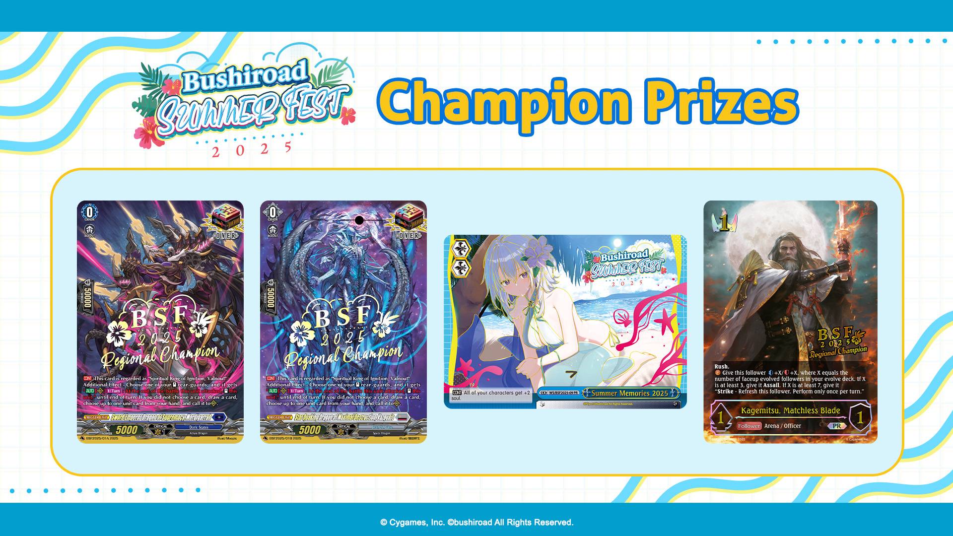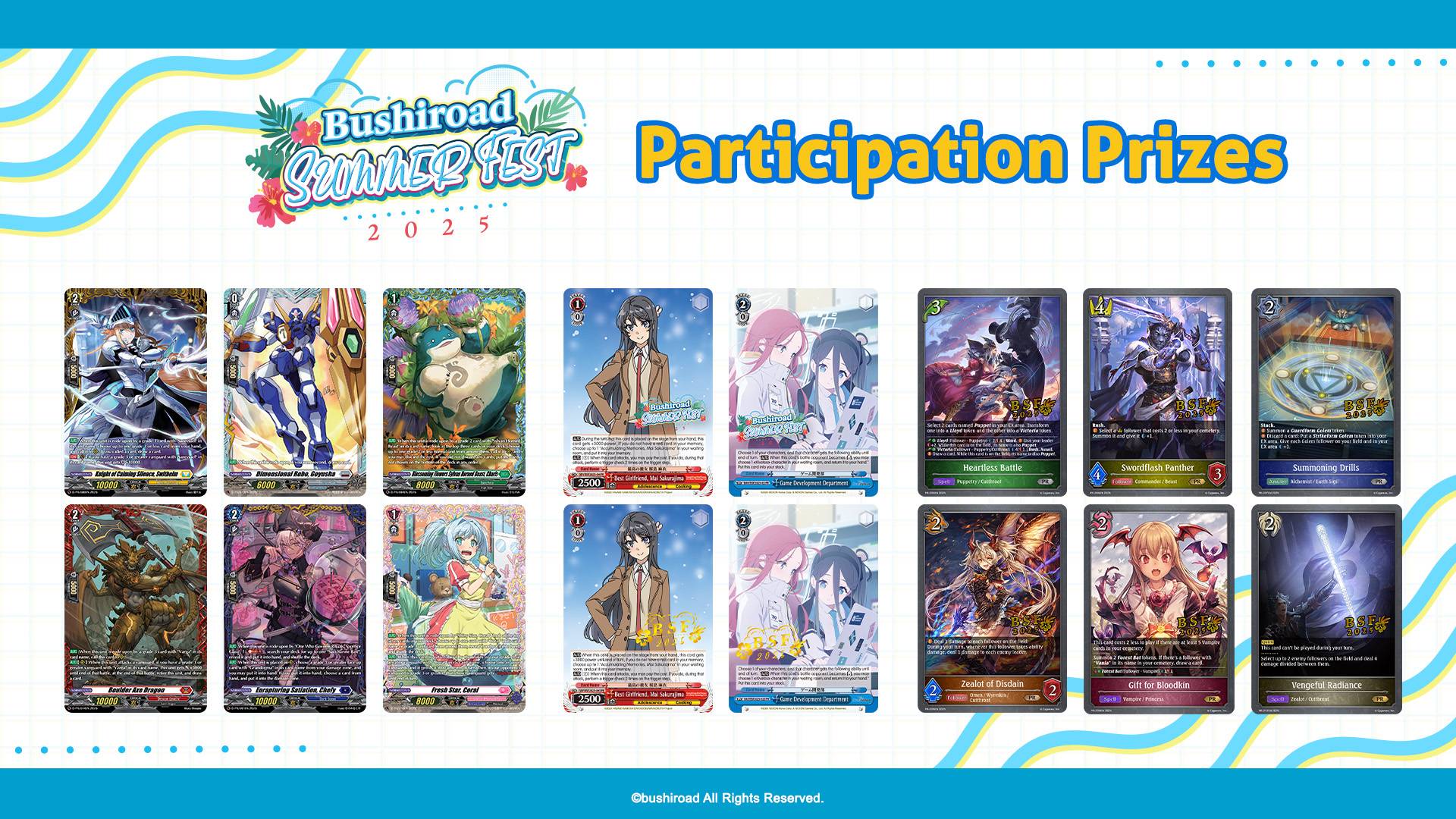 Starting this year, the Bushiroad Spring Fest will be rebranded to the Bushiroad Summer Fest. It will run from May to September and players will be still be able to take part in teams of three to compete for the promo cards seen below.
