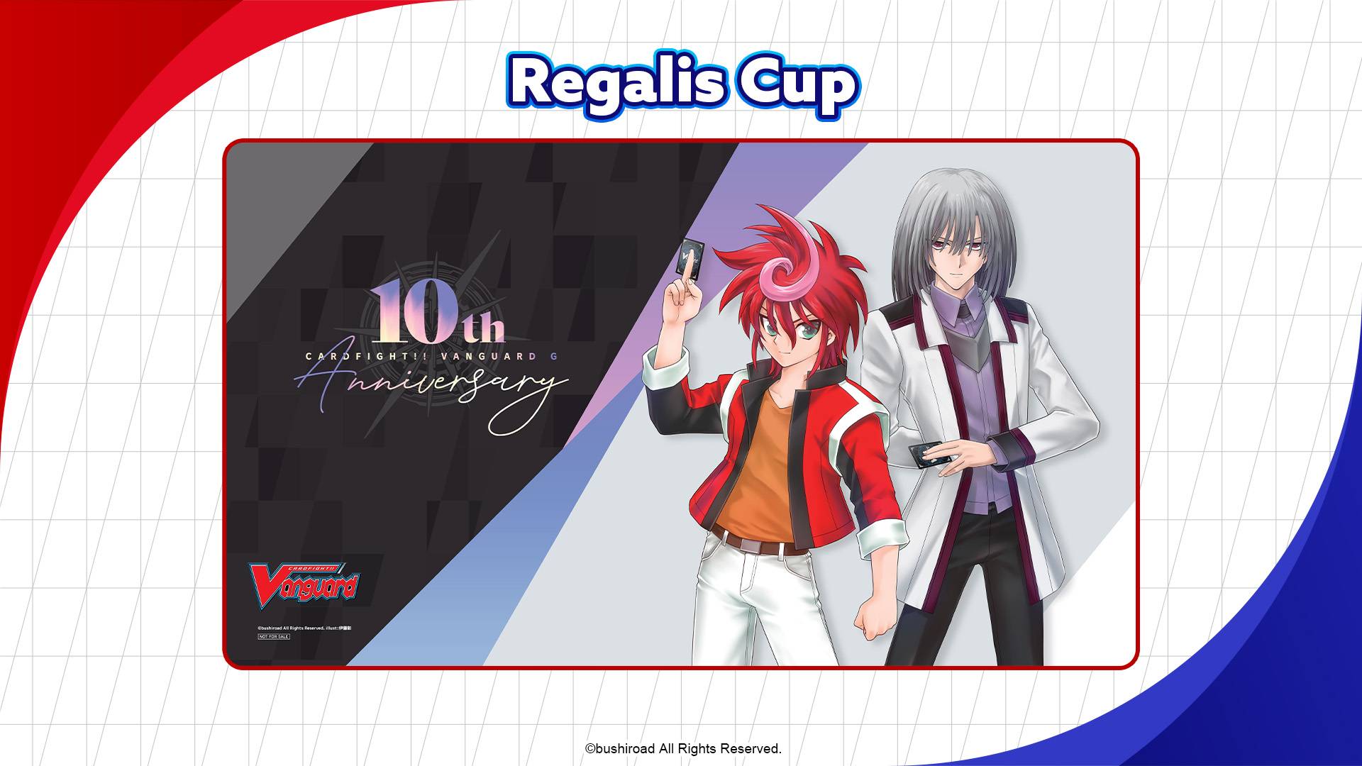 There will be a special tournament that will commemorate the 10th anniversary of Cardfight!! Vanguard G and the release of the sixth booster pack, Generation Dragenesis. Titled as the Regalis Cup, 50 stores worldwide will be hosting the special tournament. Participants will receive an April 2024 Monthly Tournament Promo Pack and the champion will walk away with this special playmat (as seen below).