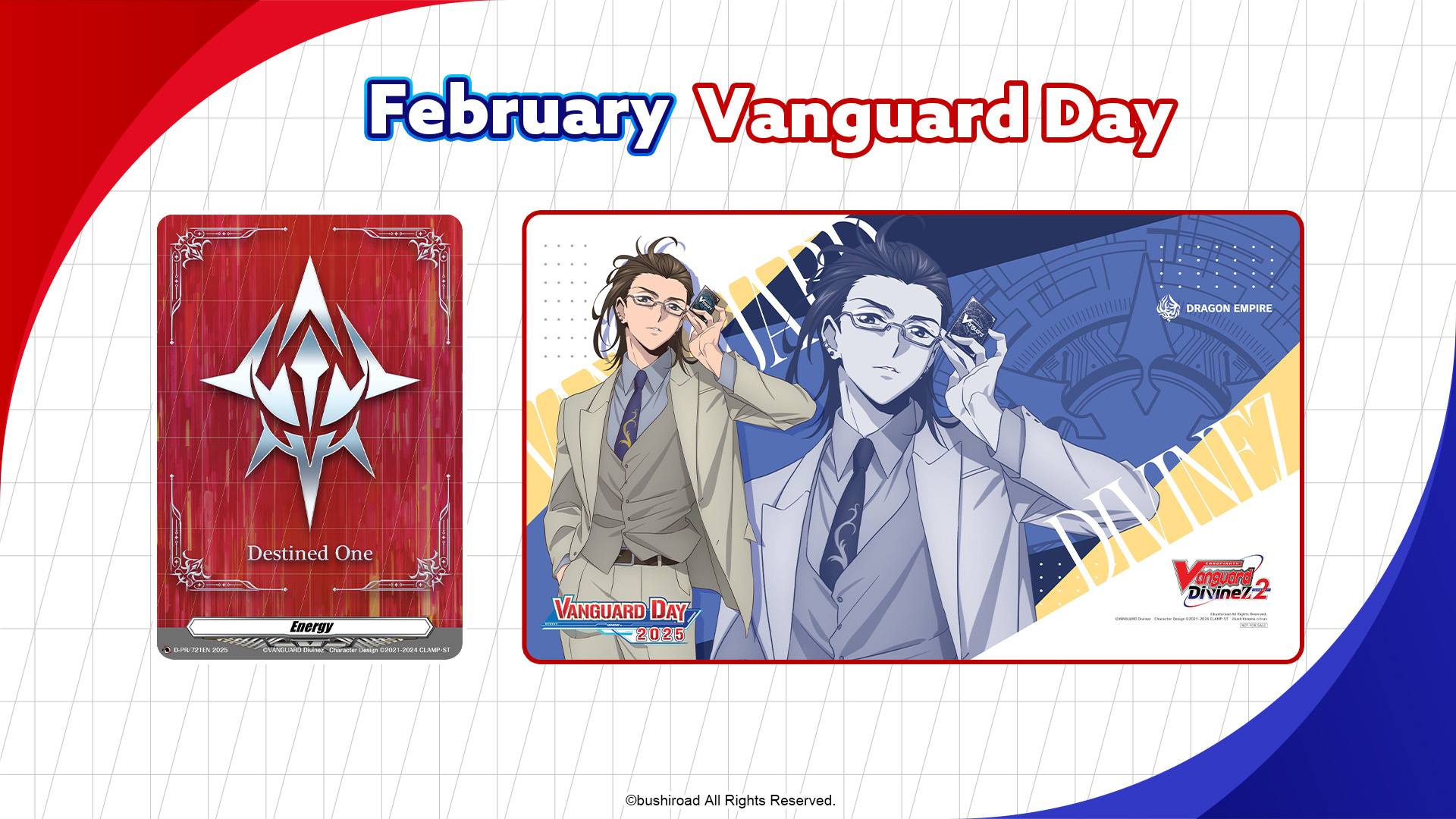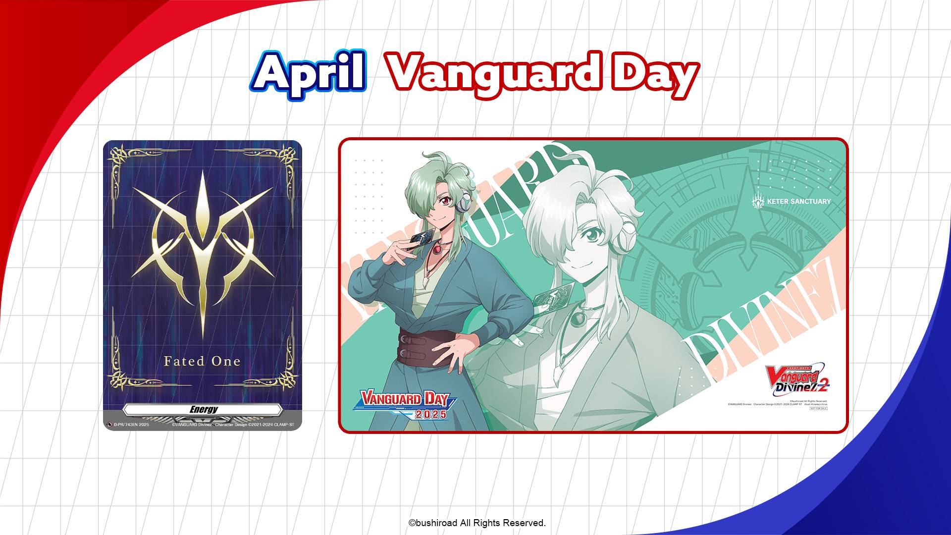 Vanguard Day returns in February. All participants will receive a Destined One Energy Card and the will receive a special playmat featuring Kyohma Kurosaki. Meanwhile, Vanguard Day on April will rewards participants with the Fated One Energy Card, and the winner will receive a special playmat featuring Jinki.