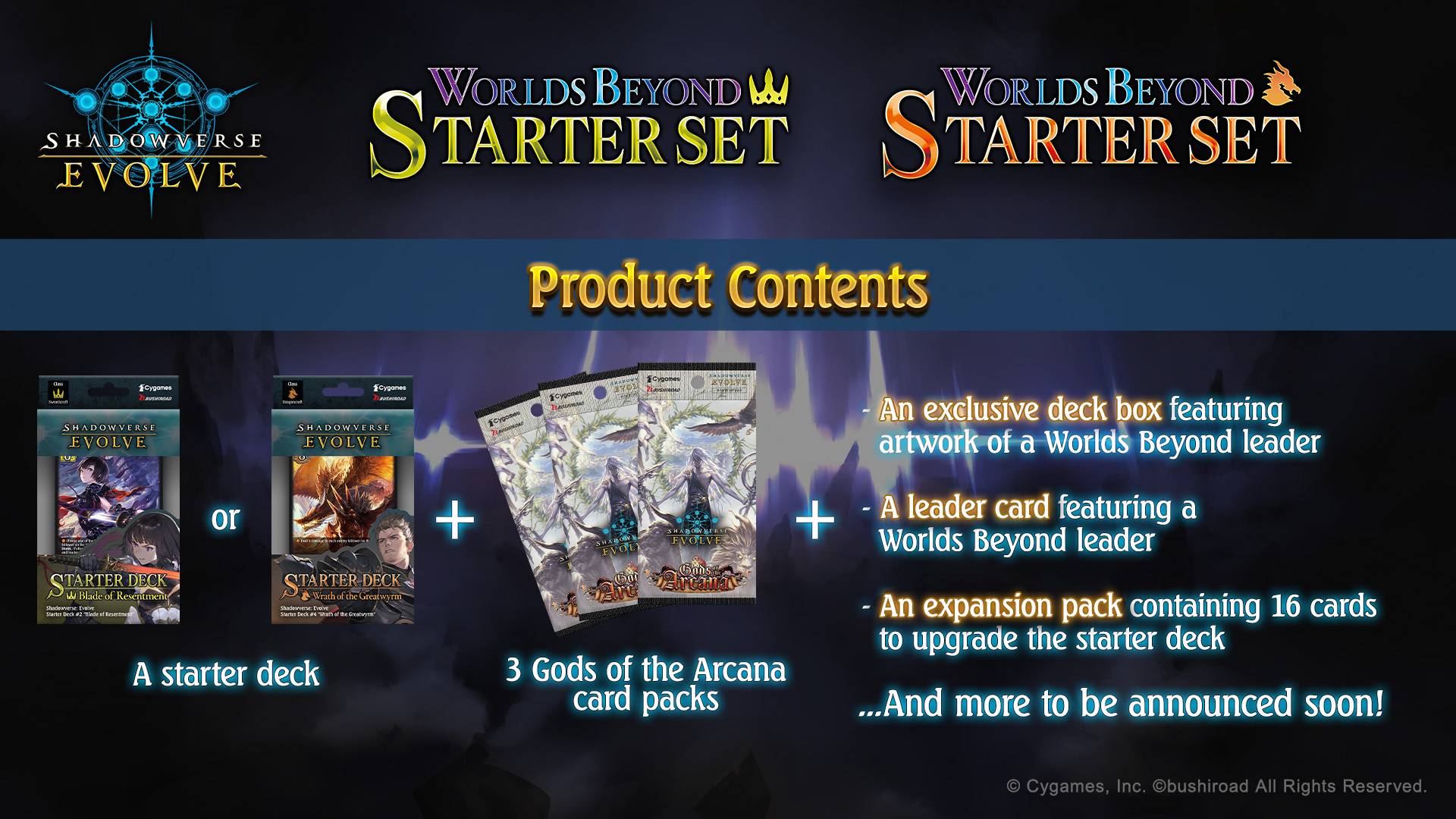 Another collaboration with Shadowverse: Evolve is Shadowverse: Worlds Beyond. Also to be released this coming June 20. Shadowverse: Worlds Beyond starter sets will contain one of the two starter decks Blade of Resentment or Wrath of the Greatwyrm. The starter sets will also carry three packs fo the 10th booster set as well as a leader card featuring artwork of one of the two new leaders from Shadowverse: Beyond.