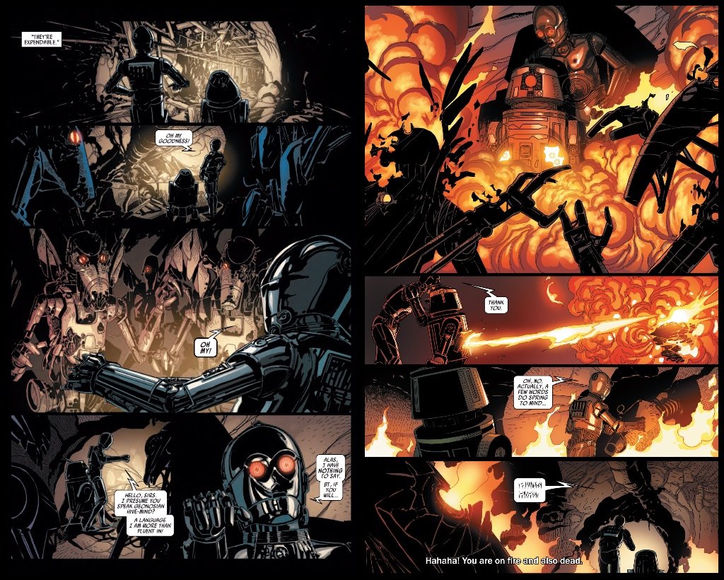 This issue walks into Aliens territory as a visit to a droid factory in Geonosis turns terrifying. A surviving Geonosian queen apparently has a droid factory from which Darth Vader and his team were to steal from. The planet has been revealed to be sterilized. Aphra sends the two droids ahead of them, and asks Vader if he’s ever been to Geonosis. Flashbacks go through Vader’s head as Vader tells her to “cease your probing.” As the droids map the route they encounter a horrible hybrid of droids with what seems to be wings and other organic material. Triple Zero comments on whether those droids spoke Geonosian hive-mind, a language he apparently is fluent in. With nothing to say, he tells BT-1 to furiously fire at them. This leads to my favorite moment, as Triple Zero says, “Oh, no, actually a few words do spring to mind! <Hahaha! You are on fire and also dead.>”