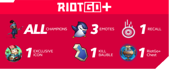 For the RiotGO+ Bundles on top of what you will already get from the RiotGO bundles (Champ unlocks, Emote, Exclusive Icon, and KilL Bauble), there’s an upgrade where you get all the champions, a random recall animation, and a lootbox.