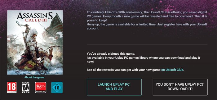 Get your digital copy of Assassin’s Creed III from Ubi Club. This is their 7th and last title to give away with their Ubi at 30 Celebration.