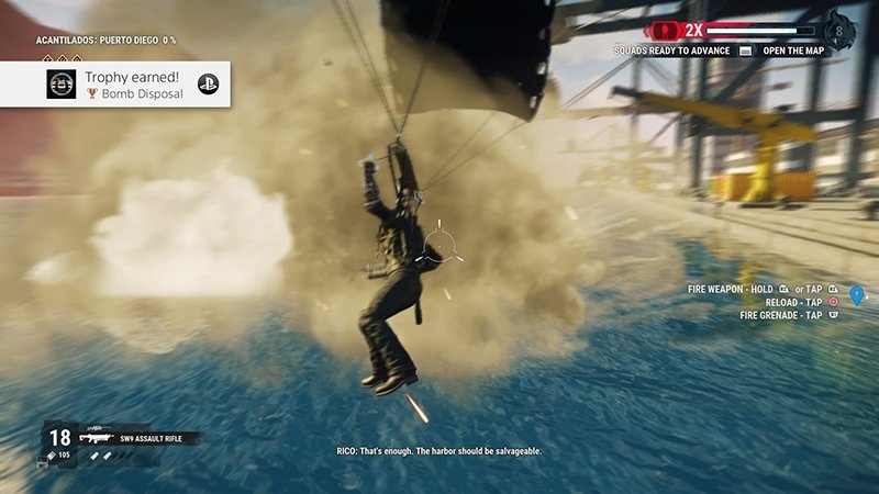 Weak antagonists aside, there’s no shortage of enemy troops and vehicles to shoot, blow up, or both. Rico’s grappling hook and its tether function are as customizable as ever. New to Rico’s arsenal is an airlifter function which is pretty much Metal Gear Solid’s Fulton System, but with the ability to adjust the maximum altitude, trajectory, and other parameters, allowing you another avenue to mess with Black Hand troops, civilians,and livestock. The rocket boosters return, and the sticky explosives are replaced with a retractor which can be powered up to ridiculous levels of strength. The ability to launch foes and various objects over absurd distances and heights is sheer brainless fun and we love it.