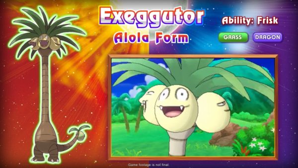 We’ll be getting the all-new Alola form for Pokemon. Shown on the video is the Alola Form for Exeggutor which turns him into a weird mix of a an exeggutor and a giraffe with a Grass-Dragon type move, Frisk.