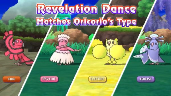 It’s attack, Revelation Dance, varies depending on the Oricorio type you’ll be getting in game. The attack types of the four are: Fire, Psychic, Electric and Ghost.