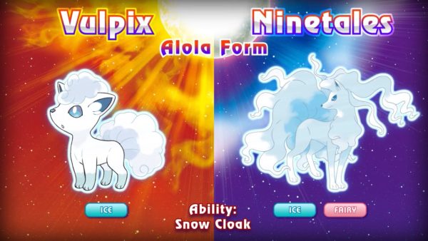 Another example for old Pokemon getting something new in their Alola form is Vulpix and Ninetales, which will be getting the Snow Cloak ability. (Ice only for Vulpix, Ice-Fairy Type attack for Ninetales).