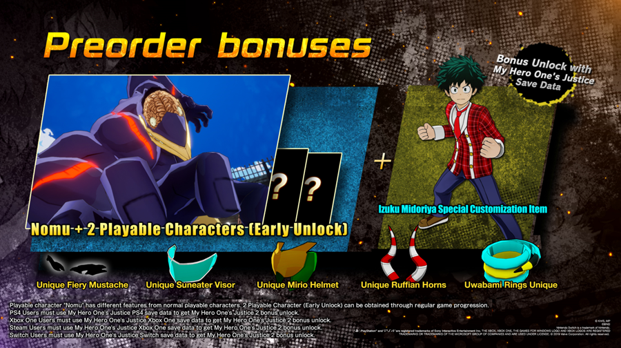 To redeem the bonus Izuku Midoriya Special Customized Item for PlayStation 4, Xbox One or Steam version My Hero One’s Justice 2, you will need saved data from the respective platform version of My Hero One’s Justice.