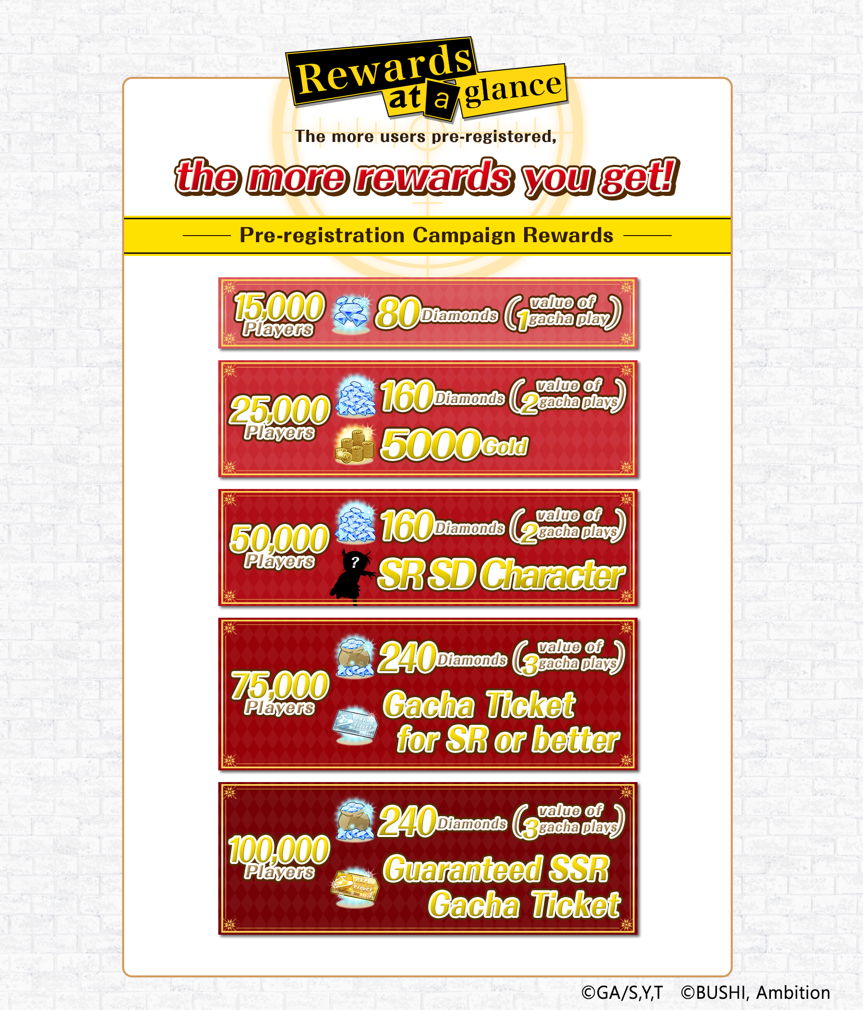 - 100,000 pre-registered players = 240 Diamonds (3 gacha play), Guaranteed SSR Gacha Ticket