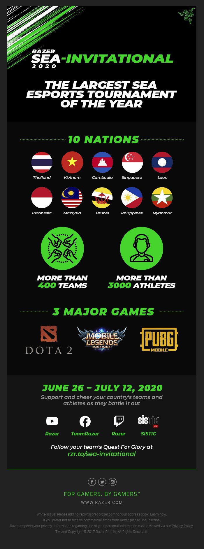 SEA-Invitational will kick off on June 26th, 2020 and culminate in the grand finals on July 10th-12th, 2020. To support and cheer for their national teams as they face off against each other in the tournament, viewers can tune into Team Razer’s social channels on Facebook, YouTube, and Twitch, for the live streams. Live streams will also be available on SISTIC Live. More information will be announced closer to date.