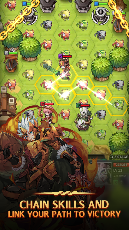 In TripleChain, players start their journey with one hero in their team of mercenaries. Join the adventure of Lionel, a warrior, who is on a mission to regain his lost memories. He is joined by an ally named Christina, a powerful wizard. Along the way, they will meet several more companions as they face tougher enemies as they progress through the story.