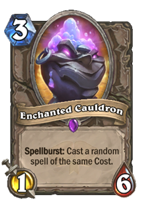 The Enchanted Cauldron would then cast a random spell that costs the same as the one you just cast. Since in this example we cast Mind Control, the random spell would also be a 10-mana spell-like Pyroblast.