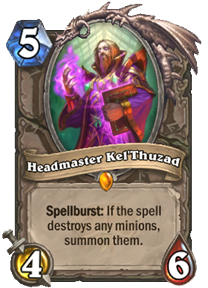 Next is the new keyword Spellburst. How this works is that a Spellburst card will activate when you cast a spell. It’s kind of like Divine Shield where if it’s used, you can’t get it back again unless you replay it from your hand. As an example, let’s look at the card Headmaster Kel’Thuzad.