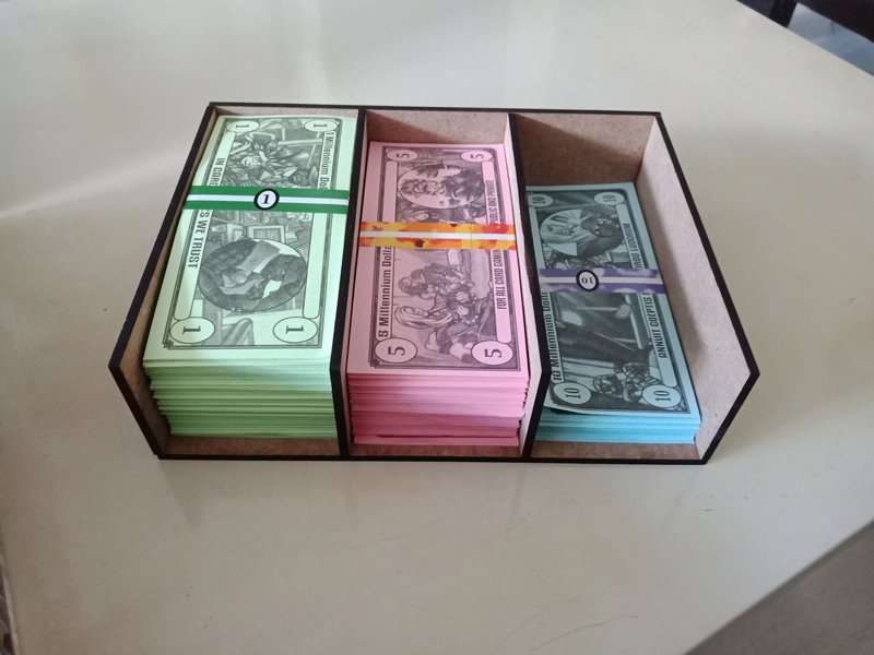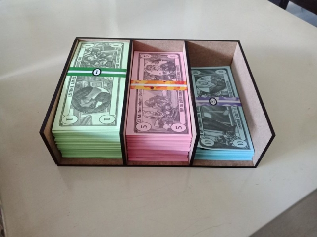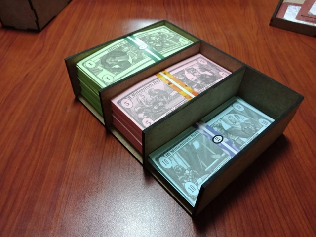 They all fit fairly well inside the game box, though a little snug there is nothing to be afraid of for the corners ripping. Some of the pieces have come undone a little especially one of the sides of my money insert, but can easily be fixed with some glue. I’ve also noticed the smaller parts of the insert look like they could easily be torn of if not careful in the assembly process.