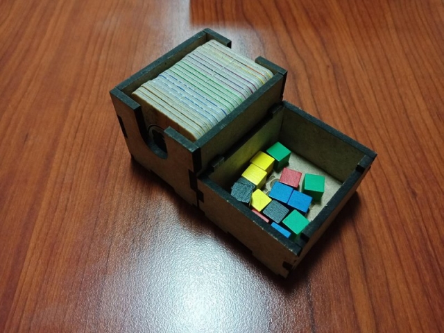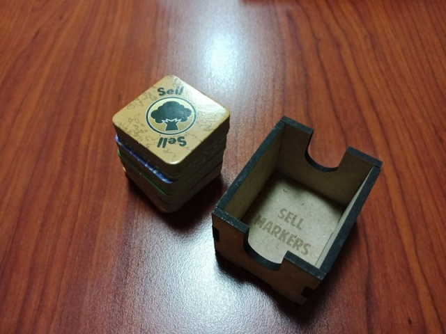 Its made of MDF board, and can be assembled easily with a rubber mallet. It comes with 2 sets of long inserts and 2 short one for the cards. It also comes with a box for keeping the VP tokens, a box with 3 dividers for the bills, 2 small stackable boxes for the sell tokens and RP markers, and a shallow box for theĀ score sheet and venue cards.