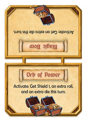 These are the cards used to power up your heroes. The card is divided into 2, one side marked with 1 treasure chest, and the other side marked with 2 treasure chests both with abilities to help the players defeat more monsters.