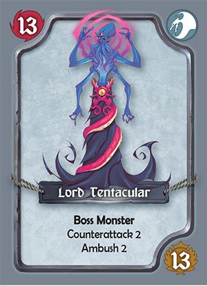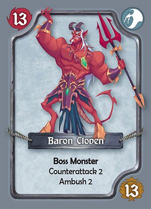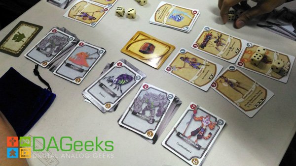 Whenever a monster is defeated we check if it has a Counterattack ability. Counterattack damage is easily calculated with counterattack number – the Shield a player has acquired with the rest dealt to the party. After you are done attacking the horde if the monster next to the village is not defeated, then the active player will draw the top village card into his victory pile as penalty, At the end of the turn we total any ambush abilities and deal the damage – shield to the party once more. The turn is passed on to the next player, and play continues until 3 boss monsters have been defeated or the village stack is gone. If the village stack is depleted then all players lose, if the bosses are defeated then players count the victory pile, with the highest points winning the game.