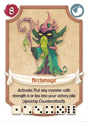 These cards are the ones players will be defeating through out the game. They share the same layout as the Hero cards with the strength in the upper left, card type on upper right, and the ability in the center, but with 2 additional icons at the bottom corners. Some monster cards will have a Treasure chest icon or 2 marked on the bottom left, what this means is that if this monster is defeated the player may draw a card from the treasure stack and use the corresponding marked side, so if you defeated a monster with 1 treasure chest icon, you may only use the side with 1 treasure chest, and same goes for the 2 treasure chest icon. On the bottom right of the card marked with a leaf with numbers in it is the Victory points earned when the monster is defeated.