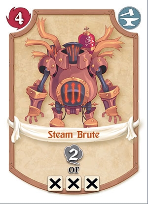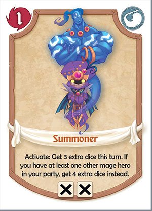 Activation costs vary from a specific dice roll, to any group of the same face, or to steam cost(found only on artificer cards). There are also 3 types of heroes in this game, and they are called the Magicians denoted by a fireball, Artificers denoted by a anvil and hammer, and the Soldiers denoted by a sword, each with their own specific theme.