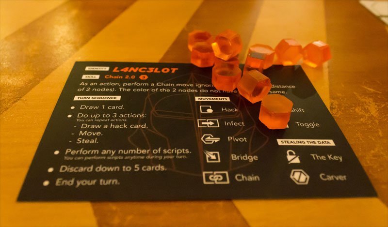 Players will take their turns one at a time. At the start of their turns they will draw 1 card, after which they are able to do 3 actions. The actions they are able to take are to Move, Steal, or Draw. In the game there are 5 ways to move around the grid: Hack, Infect, Pivot, Bridge, and Chain. Each time a player moves onto a new tile, he places his cube onto that tile replacing any cube that was there previously.