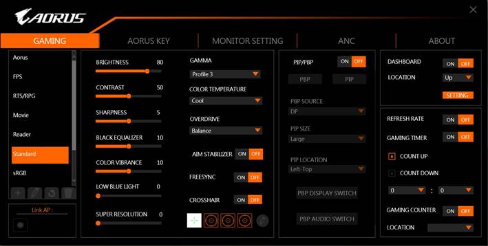 The Aorus KD25F shares the same design as the AD27QD. Digital LED lighting, the full function stand, frameless design, and built-in power board are the same as the first monitor. PiP/PbP can put 2 pictures in one screen and you can switch the audio channel to the source you want, making this monitor extra flexible for different needs. The hardware itself is amazing enough but the addition of its software features makes it incredible. Aim Stabilizer, customized crosshair, the exclusive ANC function, having all of these features in a monitor like this makes you the king of the battlefield!
