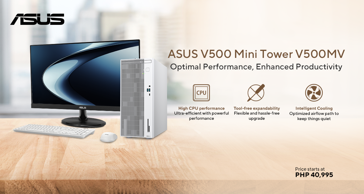 | ASUS V500MV-13420H005WSM | 15L / White / Intel Core i5-13420H / 512GB PCIe 4.0 SSD / 8GB DDR5 / Intel UHD Graphics / 330W 80+ Platinum PSU / Windows 11 Home | 21.5” IPS LED Monitor, Wired Keyboard & Mouse, 3-Year ASUS Onsite Warranty, Microsoft Office Home 2024 + Microsoft 365 Basic | ₱42,995 |