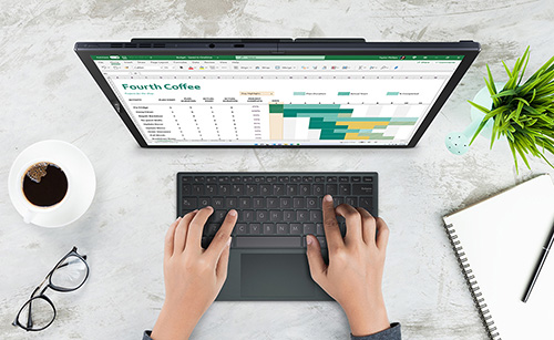 In Desktop mode, the unfolded 17.3-inch screen — propped up in landscape orientation using the built-in faux leather kickstand — can be used with the ASUS ErgoSense Bluetooth keyboard and touchpad attached wirelessly to create a powerful large-screen PC. This allows for all-day, non-stop productivity in the office or at home.