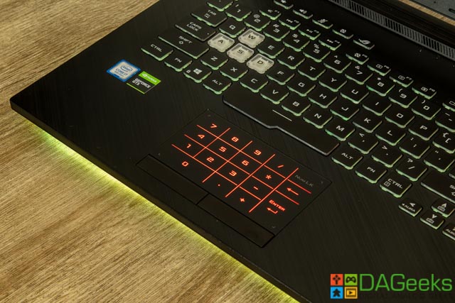 Tapping the NumLK button reveals a numeric keypad on the touchpad itself, not leaving you wanting. The keyboard is more tailored for gaming as it has the gamery font and accentuates more frequently used keys in gaming. There are gaps between the function keys to prevent pressing the wrong F key and the space bar has an extra lip to be easily reached by your thumb. There are 5 dedicated keys above the function keys which are volume controls, mic mute, performance mode and ASUS’s proprietary Armoury Crate software.