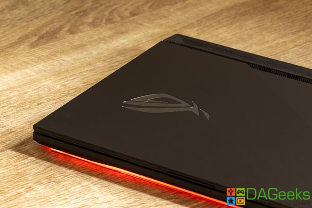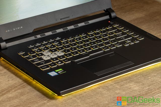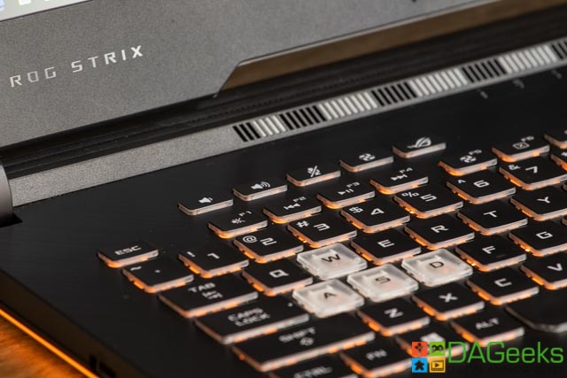 Opening up the laptop, you’ll finally see what makes it a gaming laptop. The light bar under the chassis is Aura Sync capable, so is the 4-zone RGB keyboard, and just screams RGB IS LIFE. The keyboard keys have translucent edges and the WASD keys are transparent for easier navigation during dim situations. Aura Sync also lets you connect your compatible devices for a more custom lighting experience.
