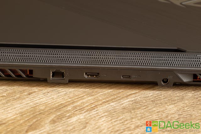 Moving to I/Os and ports, the ROG Strix G has plenty. On the back, you’ll see a gigabit LAN port, a full-sized HDMI 2.0B, a USB 3.1 Type-C, the power adapter port and a couple of vents. I do hope that this placement of ports become standard as putting them in the back side of the laptop means cables are easier to manage. Also, ASUS, a DisplayPort would be nice. On the left, you have a trifecta of USB 3.1 Type-A ports for your accessories. Hooray for not having to carry a dongle! And a 3.5mm headphone/mic jack. Nothing to see on the right side except for vents, which is a terrible placement in my opinion, unless you’re a left-handed gamer.