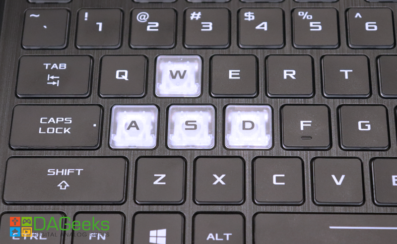 The W,A,S,D buttons have a transparent keycaps to further highlight these buttons compared to the rest of the keyboard. You can’t get any “shooter gamer” than this in a gaming laptop. ASUS continues the trend to classify their laptop line to focus either on MOBA gaming or Shooter gaming, and the FX705 is no different. As you can clearly see, the FX705 was designed with shooter gamers in mind and the keyboard layout defines it’s purpose in the hands of any gamer.