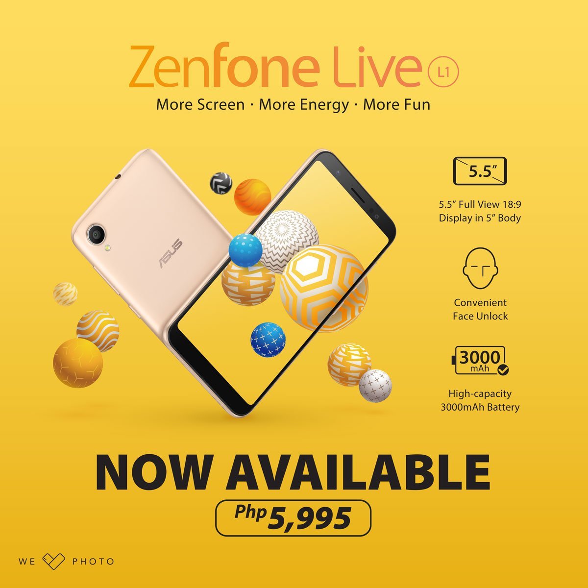 The Asus ZenFone Live L1 is now officially available in ASUS and ZenFone Concept Stores and kiosks nationwide. For an affordable price of 5,995.00 php, ZenFans can now enjoy a 5.5″18:9 HD+ screen display, a fast face unlock technology, a 3000mAh high-capacity battery, and an awesome 13 MP rear camera all in a 5″ body!