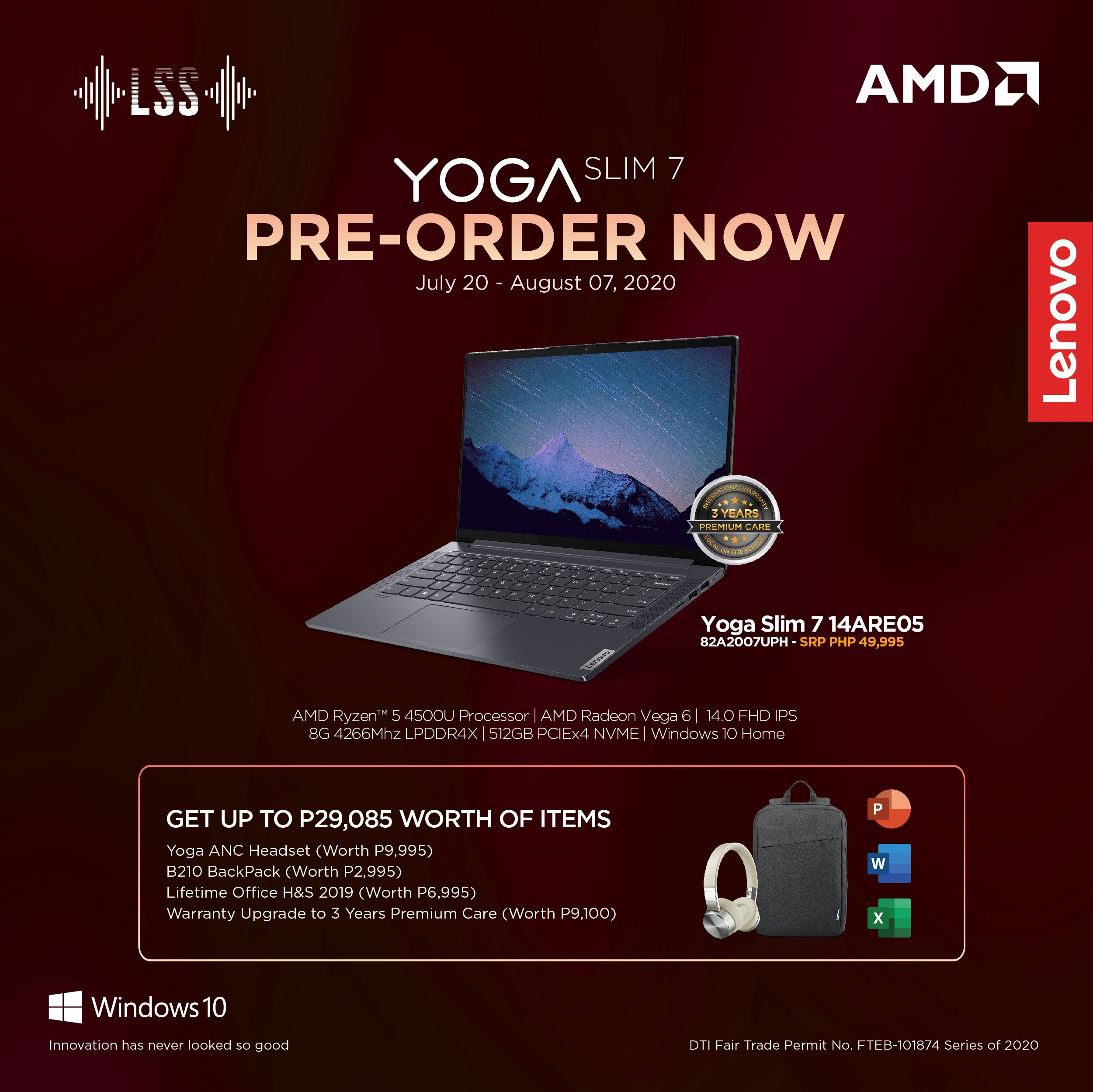 Those availing the Yoga Slim 7 with the AMD Ryzen 5 4500U processor, AMD Radeon Vega 6 graphics, 8GB 4266Mhz LPDDR4X memory, 512GB PCIEx4 NVME SSD storage, Windows 10 Home OS, and 14” FHD IPS display with SRP of ₱49,995 will get the ff: