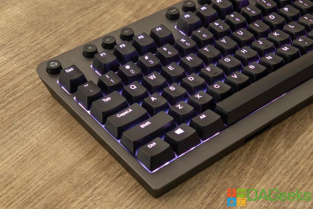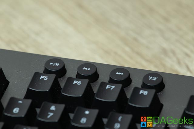 There are 7 media keys for volume up/down, play/pause, rewind, forward and a backlight key. There’s also a dedicated gaming key above the ESC key which disables the Windows key on the fly. Included on the package is a detachable arm rest if you prefer using one of those.