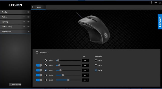 The M500 has 7 customizable buttons via the Lenovo Legion Software app. It has a left and right click, the scroll wheel, DPI up/down buttons and 2 thumb buttons. It has 3 zones of RGB lighting, although the options for it is quite limited.