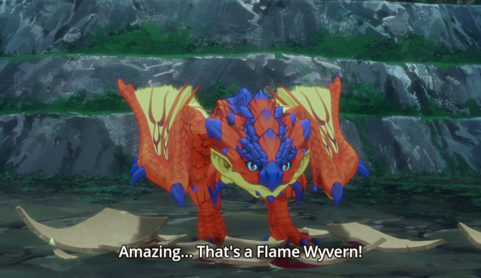 We then find our heroes stumbling into a clearing and finally catching the Monster egg that Lute had been looking for. They try and hatch the egg outside of the usual village protocol (which practically means they need a kinship stone to hatch one) to great success. Lute get’s his own monster, a baby Rathalos (or Liolaeus in Japanese) which really looks cute btw.