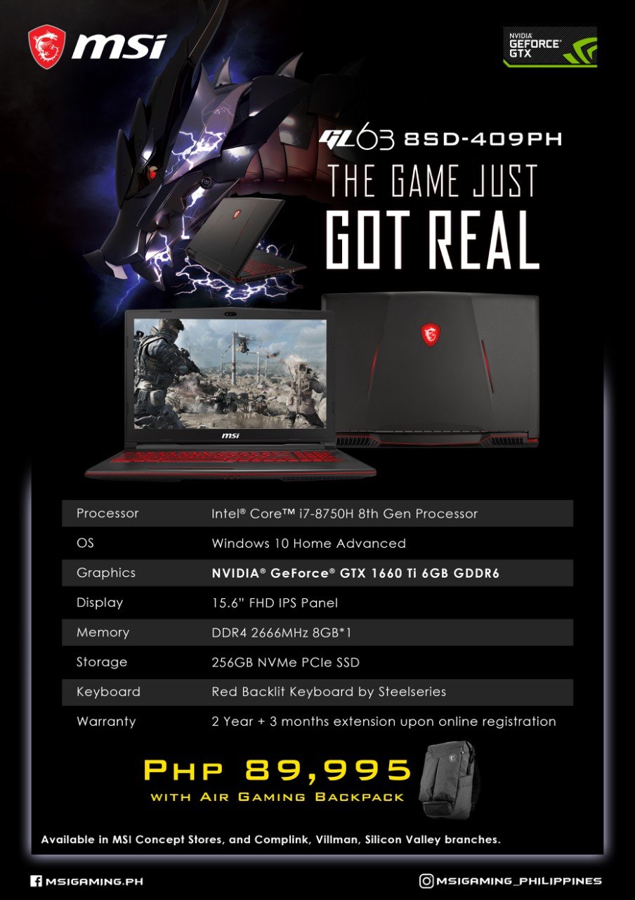 GL63 8SD-409PH with Intel Core i7-8750H partnered by NVIDIA GeForce GTX 1660Ti 6GB GDDR6 is now available at MSI Gaming Concept Stores, Complink, Villman, and Silicon Valley branches priced at 89,995 php with a free Air Gaming Backpack.