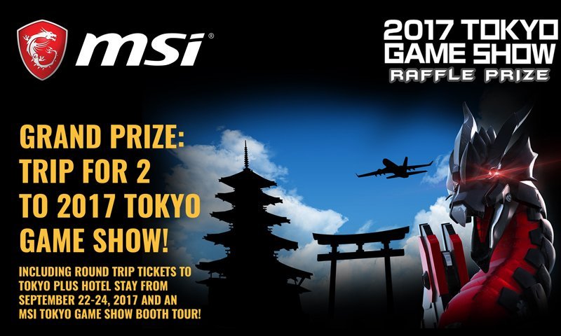 - 1st prize: Round trip tickets for two (2) to Tokyo Game Show 2017 + Hotel stay for 2 from September 22-24, 2017 + an MSI Tokyo Game Show Booth tour