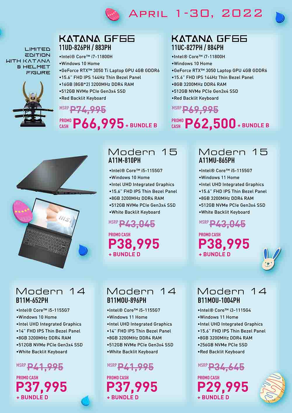 The Easter Egg-stra Promotion also includes MSI’s Thin GF65 and Katana GF66 series which are powered by the 10th and 11th Gen. Intel Core i7 processors respectively and both paired with NVIDIA’s GeForce RTX 30 Series. The Thin GF65 comes at a discounted price of ₱59,995 and the Katana GF66 series at ₱62,500 and ₱66,995 (limited edition). Get a gaming headset and thumb drive for the Katana GF66, and an additional Katana & Helmet Figure if you buy the limited edition.
