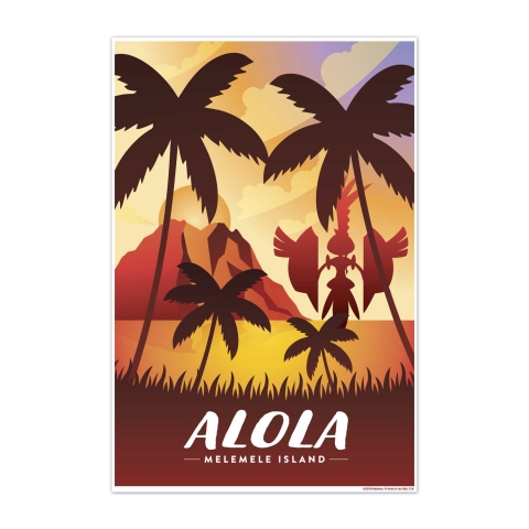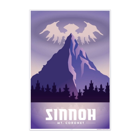 The Kanto poster features the famous S.S. Anne with Lapras swimming along side it. The Johto region has the famous Bell tower with the legendary Ho-oh in the sun set. Hoenn has the Mossdeep Space Center and opposite of the Johto, has Doexys in the moon instead. Sinnoh has the massive Mt. Coronet with Giratina sitting on top. The Unova region has Zoroark on a balcony overlooking the Skyarrow bridge. The Kalos region has the ever famous Prism tower with what I think is Hoopa flying nearby. Last but not least is Tapu Koko chilling on the beachside on Melemele island in the Alolan region.