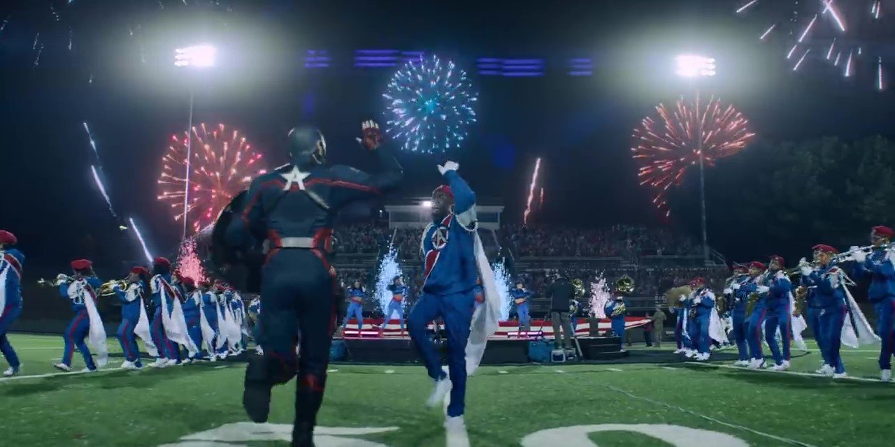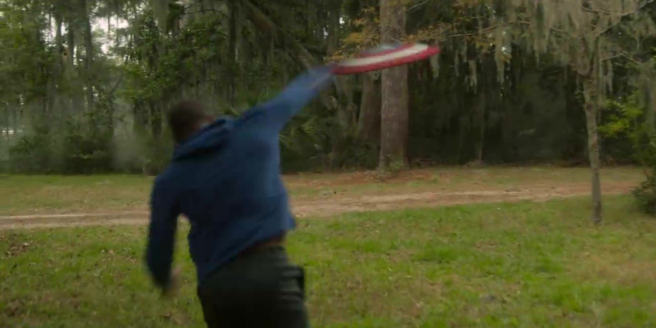 If you will recall, Steve passed his shield to Sam in the last moments of Endgame. We can clearly see in the upper frame how he’s practicing to wield it. However, we also see him retaining his Falcon outfit. Does that mean he relinquishes the mantle to another person…