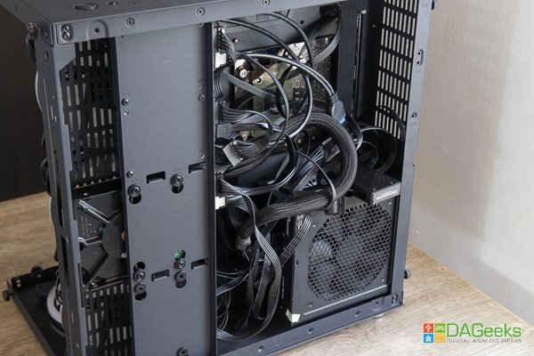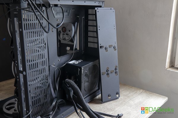 The case is partitioned and you’ll only see the motherboard upfront. The PSU and drive mounts are at the back, making for a cleaner look. You’ll see that there’s lots of room for cable management at the back and the partition makes it easier to close the backside, leaving the front neat and clean.
