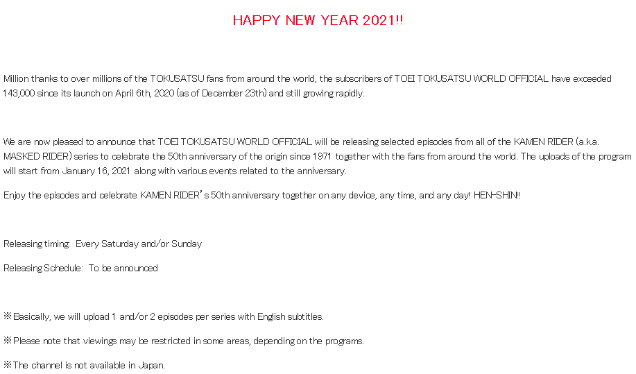 The official Toei Tokusatsu World Official YouTube Channel through a site post has announced that they will be releasing 1 or 2 episodes per series with English subtitles every Saturday or Sunday.